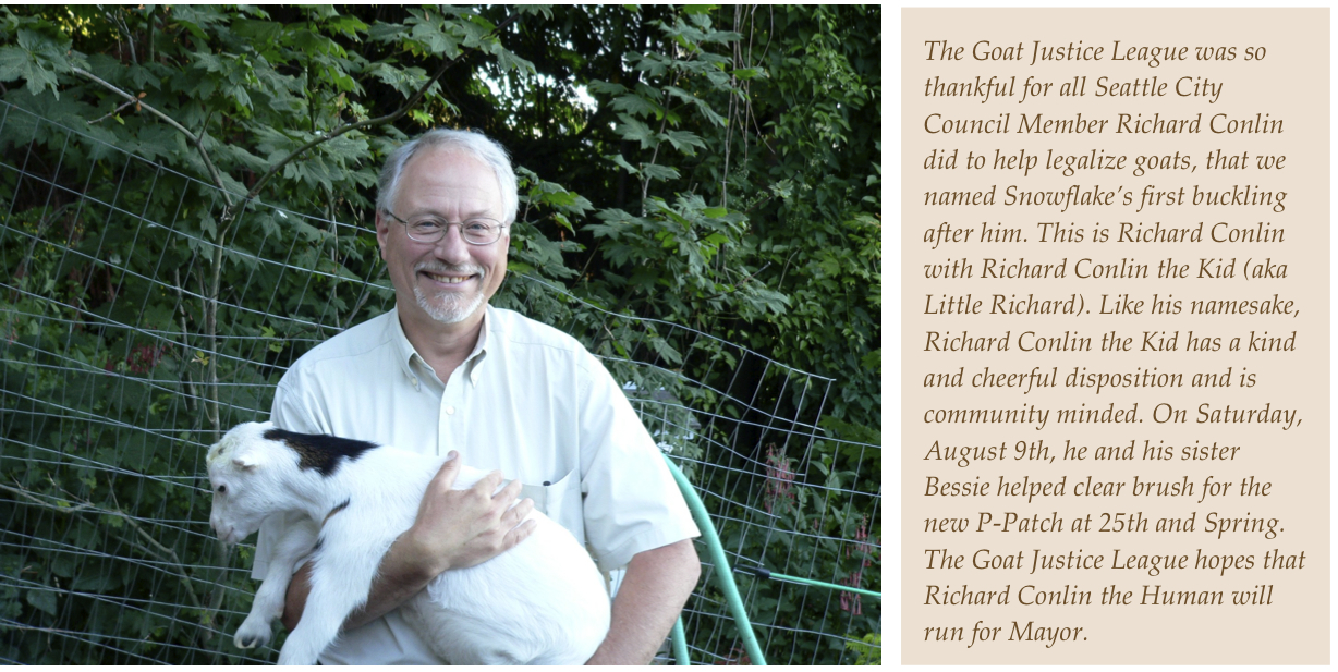 It simply does not make sense that most cities prohibit goats but allow dogs, even ones powerful enough to kill people. Goats are generally quiet, docile, don’t smell (except for un-neutered males — and these aren’t allowed under Seattle’s new pro-goat rules), useful, and generally nice to have around. Until last 2007, the City of Seattle considered goats farm animals. Today, they have been reclassified as small animals, joining the ranks of dogs and cats. Bucks (unneutered males) are not allowed and goats must be disbudded.