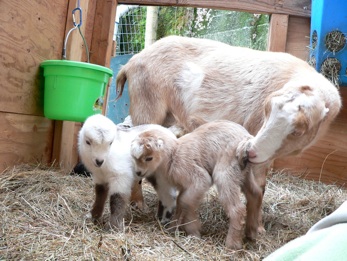 Brownie cleans up her new kids, Rosie Fluffy Socks and Phyllis Schulman. Brownie was an extremely fine mother. She passed away in 2010, but her kids and grandkids live on working as family dairy goats or Rent-a-Ruminant. Rent-a-ruminant treats its employees well and offers a generous health care and retirement package. The goats who work for Rent-a-Ruminant love their work.