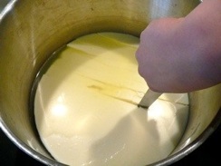 - Once the milk has reached 90℉ (It’s okay if you overshoot a little and hit 105℉) add the rennet. Thoroughly, but gently, stir the rennet into the warm milk for thirty seconds with an up and down motion as well as a round the pot motion.