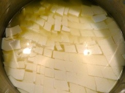 - Cut the curd mass into 1/2 inch pieces. To do this, use a long knife and cut lines, from the surface of the curd all the way to the bottom of the pot ½ inch apart. Then, do this again, in the opposite direction so that you’ve created a grid of cuts. Then, hold the knife at a 45 angle and cut lines and then turn the pot 90 degrees and do this again. The idea is to cut the curd into something approximating ½ inch by ½ inch by ½ inch pieces. Don’t worry about being exact. (See pictures below)
