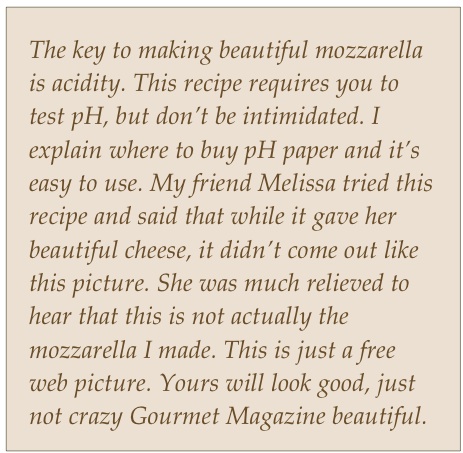 This recipe makes almost a pound and a half of mozzarella and should take you an hour to an hour and and a half. Making mozzarella is trickier than making chevre or fromage blanc, but it is also more gratifying. You’ll get to watch everyday milk transformed into a remarkably elastic and glossy mass that you will stretch and fold into truly delicious mozzarella. The key to making mozzarella is the acidity of the milk. You will increase your milk’s acidity by adding citric acid, but how much citric acid you need will depend on your milk. That’s why you need to use pH test paper. This may sound intimidating and bring back bad memories of chemistry lab, but pH test paper is easy to use and will help prevent you from ending up with a funny looking mozzarella-like blob.